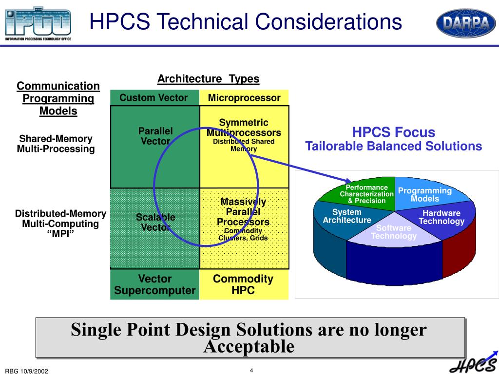 High ProductivityComputing Systems • Goal: • Provide a new generation of economically viable high productivity computing systems for the national security and industrial user community (2007 – 2010) Impact: • Performance (time-to-solution): speedup critical national security applications by a factor of 10X to 40X • Programmability (time-for-idea-to-first-solution): reduce cost and time of developing application solutions • Portability (transparency): insulate research and operational application software from system • Robustness (reliability): apply all known techniques to protect against outside attacks, hardware faults, & programming errors HPCS Program Focus Areas • Applications: • Intelligence/surveillance, reconnaissance, cryptanalysis, weapons analysis, airborne contaminant modeling and biotechnology Fill the Critical Technology and Capability Gap Today (late 80’s HPC technology)…..to…..Future (Quantum/Bio Computing)