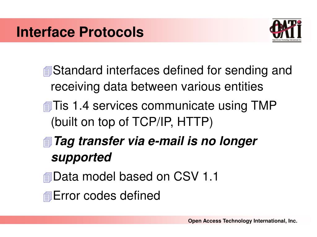 Interface Protocols • Standard interfaces defined for sending and receiving data between various entities • Tis 1.4 services communicate using TMP (built on top of TCP/IP, HTTP) • Tag transfer via e-mail is no longer supported • Data model based on CSV 1.1 • Error codes defined