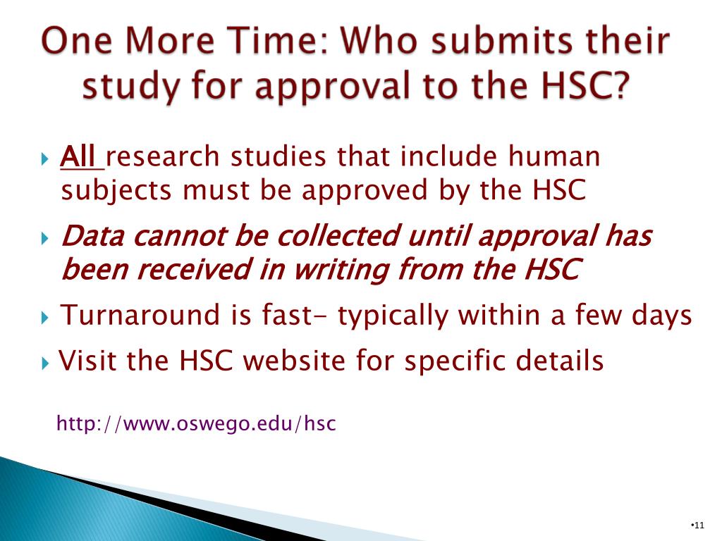 All research studies that include human subjects must be approved by the HSC • Data cannot be collected until approval has been received in writing from the HSC • Turnaround is fast- typically within a few days • Visit the HSC website for specific details http://www.oswego.edu/hsc