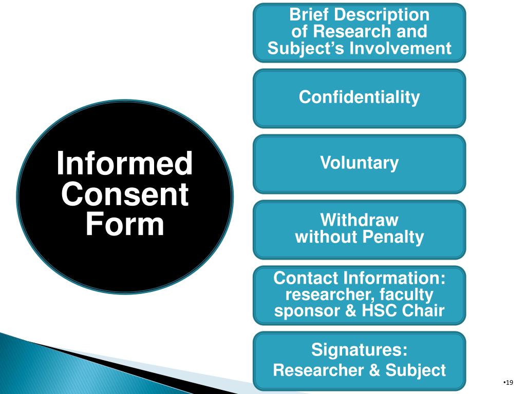 Brief Description of Research and Subject’s Involvement Confidentiality Informed Consent Form Voluntary Withdraw without Penalty Contact Information: researcher, faculty sponsor & HSC Chair Signatures: Researcher & Subject