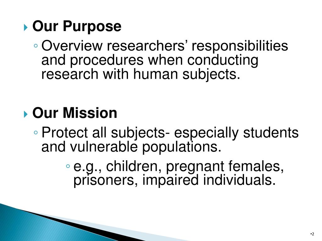 Our Purpose • Overview researchers’ responsibilities and procedures when conducting research with human subjects. • Our Mission • Protect all subjects- especially students and vulnerable populations. • e.g., children, pregnant females, prisoners, impaired individuals.