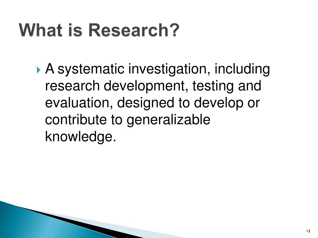 A systematic investigation, including research development, testing and evaluation, designed to develop or contribute to generalizable knowledge.