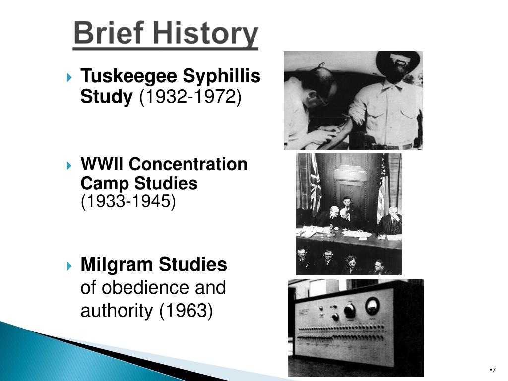 Tuskeegee Syphillis Study (1932-1972) • Milgram Studies of obedience and authority (1963) • WWII Concentration Camp Studies (1933-1945)