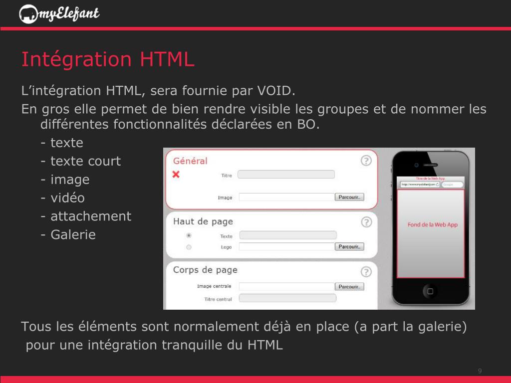 Intégration HTML L’intégration HTML, sera fournie par VOID. En gros elle permet de bien rendre visible les groupes et de nommer les différentes fonctionnalités déclarées en BO. - texte - texte court - image - vidéo - attachement - Galerie Tous les éléments sont normalement déjà en place (a part la galerie) pour une intégration tranquille du HTML
