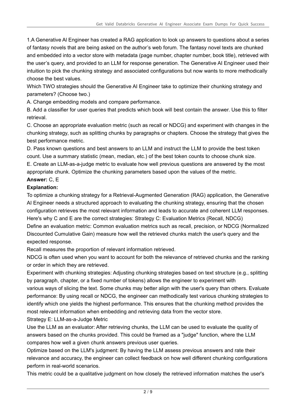 Get Valid Databricks Generative AI Engineer Associate Exam Dumps For Quick Success 1.A Generative Al Engineer has created a RAG application to look up answers to questions about a series of fantasy novels that are being asked on the author’s web forum. The fantasy novel texts are chunked and embedded into a vector store with metadata (page number, chapter number, book title), retrieved with the user’s query, and provided to an LLM for response generation. The Generative AI Engineer used their intuition to pick the chunking strategy and associated configurations but now wants to more methodically choose the best values. Which TWO strategies should the Generative AI Engineer take to optimize their chunking strategy and parameters? (Choose two.) A. Change embedding models and compare performance. B. Add a classifier for user queries that predicts which book will best contain the answer. Use this to filter retrieval. C. Choose an appropriate evaluation metric (such as recall or NDCG) and experiment with changes in the chunking strategy, such as splitting chunks by paragraphs or chapters. Choose the strategy that gives the best performance metric. D. Pass known questions and best answers to an LLM and instruct the LLM to provide the best token count. Use a summary statistic (mean, median, etc.) of the best token counts to choose chunk size. E. Create an LLM-as-a-judge metric to evaluate how well previous questions are answered by the most appropriate chunk. Optimize the chunking parameters based upon the values of the metric. Answer: C, E Explanation: To optimize a chunking strategy for a Retrieval-Augmented Generation (RAG) application, the Generative AI Engineer needs a structured approach to evaluating the chunking strategy, ensuring that the chosen configuration retrieves the most relevant information and leads to accurate and coherent LLM responses. Here's why C and E are the correct strategies: Strategy C: Evaluation Metrics (Recall, NDCG) Define an evaluation metric: Common evaluation metrics such as recall, precision, or NDCG (Normalized Discounted Cumulative Gain) measure how well the retrieved chunks match the user's query and the expected response. Recall measures the proportion of relevant information retrieved. NDCG is often used when you want to account for both the relevance of retrieved chunks and the ranking or order in which they are retrieved. Experiment with chunking strategies: Adjusting chunking strategies based on text structure (e.g., splitting by paragraph, chapter, or a fixed number of tokens) allows the engineer to experiment with various ways of slicing the text. Some chunks may better align with the user's query than others. Evaluate performance: By using recall or NDCG, the engineer can methodically test various chunking strategies to identify which one yields the highest performance. This ensures that the chunking method provides the most relevant information when embedding and retrieving data from the vector store. Strategy E: LLM-as-a-Judge Metric Use the LLM as an evaluator: After retrieving chunks, the LLM can be used to evaluate the quality of answers based on the chunks provided. This could be framed as a "judge" function, where the LLM compares how well a given chunk answers previous user queries. Optimize based on the LLM's judgment: By having the LLM assess previous answers and rate their relevance and accuracy, the engineer can collect feedback on how well different chunking configurations perform in real-world scenarios. This metric could be a qualitative judgment on how closely the retrieved information matches the user's 2 / 9