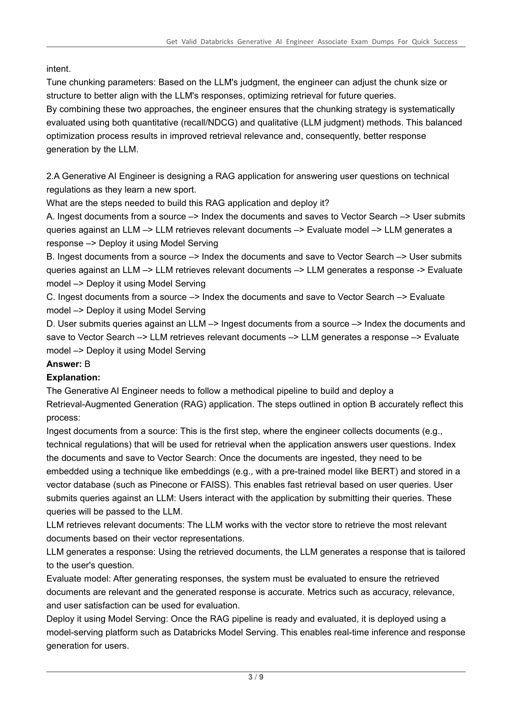 Get Valid Databricks Generative AI Engineer Associate Exam Dumps For Quick Success intent. Tune chunking parameters: Based on the LLM's judgment, the engineer can adjust the chunk size or structure to better align with the LLM's responses, optimizing retrieval for future queries. By combining these two approaches, the engineer ensures that the chunking strategy is systematically evaluated using both quantitative (recall/NDCG) and qualitative (LLM judgment) methods. This balanced optimization process results in improved retrieval relevance and, consequently, better response generation by the LLM. 2.A Generative AI Engineer is designing a RAG application for answering user questions on technical regulations as they learn a new sport. What are the steps needed to build this RAG application and deploy it? A. Ingest documents from a source –> Index the documents and saves to Vector Search –> User submits queries against an LLM –> LLM retrieves relevant documents –> Evaluate model –> LLM generates a response –> Deploy it using Model Serving B. Ingest documents from a source –> Index the documents and save to Vector Search –> User submits queries against an LLM –> LLM retrieves relevant documents –> LLM generates a response -> Evaluate model –> Deploy it using Model Serving C. Ingest documents from a source –> Index the documents and save to Vector Search –> Evaluate model –> Deploy it using Model Serving D. User submits queries against an LLM –> Ingest documents from a source –> Index the documents and save to Vector Search –> LLM retrieves relevant documents –> LLM generates a response –> Evaluate model –> Deploy it using Model Serving Answer: B Explanation: The Generative AI Engineer needs to follow a methodical pipeline to build and deploy a Retrieval-Augmented Generation (RAG) application. The steps outlined in option B accurately reflect this process: Ingest documents from a source: This is the first step, where the engineer collects documents (e.g., technical regulations) that will be used for retrieval when the application answers user questions. Index the documents and save to Vector Search: Once the documents are ingested, they need to be embedded using a technique like embeddings (e.g., with a pre-trained model like BERT) and stored in a vector database (such as Pinecone or FAISS). This enables fast retrieval based on user queries. User submits queries against an LLM: Users interact with the application by submitting their queries. These queries will be passed to the LLM. LLM retrieves relevant documents: The LLM works with the vector store to retrieve the most relevant documents based on their vector representations. LLM generates a response: Using the retrieved documents, the LLM generates a response that is tailored to the user's question. Evaluate model: After generating responses, the system must be evaluated to ensure the retrieved documents are relevant and the generated response is accurate. Metrics such as accuracy, relevance, and user satisfaction can be used for evaluation. Deploy it using Model Serving: Once the RAG pipeline is ready and evaluated, it is deployed using a model-serving platform such as Databricks Model Serving. This enables real-time inference and response generation for users. 3 / 9