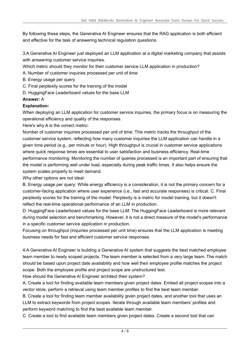 Get Valid Databricks Generative AI Engineer Associate Exam Dumps For Quick Success By following these steps, the Generative AI Engineer ensures that the RAG application is both efficient and effective for the task of answering technical regulation questions. 3.A Generative AI Engineer just deployed an LLM application at a digital marketing company that assists with answering customer service inquiries. Which metric should they monitor for their customer service LLM application in production? A. Number of customer inquiries processed per unit of time B. Energy usage per query C. Final perplexity scores for the training of the model D. HuggingFace Leaderboard values for the base LLM Answer: A Explanation: When deploying an LLM application for customer service inquiries, the primary focus is on measuring the operational efficiency and quality of the responses. Here's why A is the correct metric: Number of customer inquiries processed per unit of time: This metric tracks the throughput of the customer service system, reflecting how many customer inquiries the LLM application can handle in a given time period (e.g., per minute or hour). High throughput is crucial in customer service applications where quick response times are essential to user satisfaction and business efficiency. Real-time performance monitoring: Monitoring the number of queries processed is an important part of ensuring that the model is performing well under load, especially during peak traffic times. It also helps ensure the system scales properly to meet demand. Why other options are not ideal: B. Energy usage per query: While energy efficiency is a consideration, it is not the primary concern for a customer-facing application where user experience (i.e., fast and accurate responses) is critical. C. Final perplexity scores for the training of the model: Perplexity is a metric for model training, but it doesn't reflect the real-time operational performance of an LLM in production. D. HuggingFace Leaderboard values for the base LLM: The HuggingFace Leaderboard is more relevant during model selection and benchmarking. However, it is not a direct measure of the model's performance in a specific customer service application in production. Focusing on throughput (inquiries processed per unit time) ensures that the LLM application is meeting business needs for fast and efficient customer service responses. 4.A Generative AI Engineer is building a Generative AI system that suggests the best matched employee team member to newly scoped projects. The team member is selected from a very large team. The match should be based upon project date availability and how well their employee profile matches the project scope. Both the employee profile and project scope are unstructured text. How should the Generative Al Engineer architect their system? A. Create a tool for finding available team members given project dates. Embed all project scopes into a vector store, perform a retrieval using team member profiles to find the best team member. B. Create a tool for finding team member availability given project dates, and another tool that uses an LLM to extract keywords from project scopes. Iterate through available team members’ profiles and perform keyword matching to find the best available team member. C. Create a tool to find available team members given project dates. Create a second tool that can 4 / 9