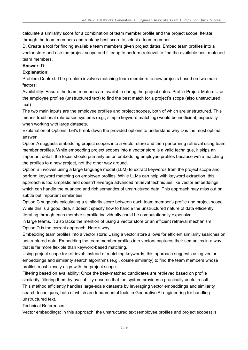 Get Valid Databricks Generative AI Engineer Associate Exam Dumps For Quick Success calculate a similarity score for a combination of team member profile and the project scope. Iterate through the team members and rank by best score to select a team member. D. Create a tool for finding available team members given project dates. Embed team profiles into a vector store and use the project scope and filtering to perform retrieval to find the available best matched team members. Answer: D Explanation: Problem Context: The problem involves matching team members to new projects based on two main factors: Availability: Ensure the team members are available during the project dates. Profile-Project Match: Use the employee profiles (unstructured text) to find the best match for a project’s scope (also unstructured text). The two main inputs are the employee profiles and project scopes, both of which are unstructured. This means traditional rule-based systems (e.g., simple keyword matching) would be inefficient, especially when working with large datasets. Explanation of Options: Let's break down the provided options to understand why D is the most optimal answer. Option A suggests embedding project scopes into a vector store and then performing retrieval using team member profiles. While embedding project scopes into a vector store is a valid technique, it skips an important detail: the focus should primarily be on embedding employee profiles because we're matching the profiles to a new project, not the other way around. Option B involves using a large language model (LLM) to extract keywords from the project scope and perform keyword matching on employee profiles. While LLMs can help with keyword extraction, this approach is too simplistic and doesn’t leverage advanced retrieval techniques like vector embeddings, which can handle the nuanced and rich semantics of unstructured data. This approach may miss out on subtle but important similarities. Option C suggests calculating a similarity score between each team member's profile and project scope. While this is a good idea, it doesn’t specify how to handle the unstructured nature of data efficiently. Iterating through each member’s profile individually could be computationally expensive in large teams. It also lacks the mention of using a vector store or an efficient retrieval mechanism. Option D is the correct approach. Here’s why: Embedding team profiles into a vector store: Using a vector store allows for efficient similarity searches on unstructured data. Embedding the team member profiles into vectors captures their semantics in a way that is far more flexible than keyword-based matching. Using project scope for retrieval: Instead of matching keywords, this approach suggests using vector embeddings and similarity search algorithms (e.g., cosine similarity) to find the team members whose profiles most closely align with the project scope. Filtering based on availability: Once the best-matched candidates are retrieved based on profile similarity, filtering them by availability ensures that the system provides a practically useful result. This method efficiently handles large-scale datasets by leveraging vector embeddings and similarity search techniques, both of which are fundamental tools in Generative AI engineering for handling unstructured text. Technical References: Vector embeddings: In this approach, the unstructured text (employee profiles and project scopes) is 5 / 9