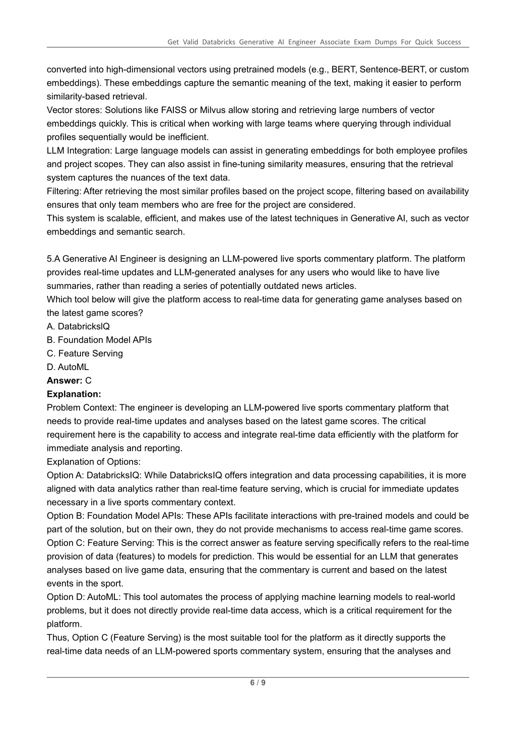 Get Valid Databricks Generative AI Engineer Associate Exam Dumps For Quick Success converted into high-dimensional vectors using pretrained models (e.g., BERT, Sentence-BERT, or custom embeddings). These embeddings capture the semantic meaning of the text, making it easier to perform similarity-based retrieval. Vector stores: Solutions like FAISS or Milvus allow storing and retrieving large numbers of vector embeddings quickly. This is critical when working with large teams where querying through individual profiles sequentially would be inefficient. LLM Integration: Large language models can assist in generating embeddings for both employee profiles and project scopes. They can also assist in fine-tuning similarity measures, ensuring that the retrieval system captures the nuances of the text data. Filtering: After retrieving the most similar profiles based on the project scope, filtering based on availability ensures that only team members who are free for the project are considered. This system is scalable, efficient, and makes use of the latest techniques in Generative AI, such as vector embeddings and semantic search. 5.A Generative AI Engineer is designing an LLM-powered live sports commentary platform. The platform provides real-time updates and LLM-generated analyses for any users who would like to have live summaries, rather than reading a series of potentially outdated news articles. Which tool below will give the platform access to real-time data for generating game analyses based on the latest game scores? A. DatabrickslQ B. Foundation Model APIs C. Feature Serving D. AutoML Answer: C Explanation: Problem Context: The engineer is developing an LLM-powered live sports commentary platform that needs to provide real-time updates and analyses based on the latest game scores. The critical requirement here is the capability to access and integrate real-time data efficiently with the platform for immediate analysis and reporting. Explanation of Options: Option A: DatabricksIQ: While DatabricksIQ offers integration and data processing capabilities, it is more aligned with data analytics rather than real-time feature serving, which is crucial for immediate updates necessary in a live sports commentary context. Option B: Foundation Model APIs: These APIs facilitate interactions with pre-trained models and could be part of the solution, but on their own, they do not provide mechanisms to access real-time game scores. Option C: Feature Serving: This is the correct answer as feature serving specifically refers to the real-time provision of data (features) to models for prediction. This would be essential for an LLM that generates analyses based on live game data, ensuring that the commentary is current and based on the latest events in the sport. Option D: AutoML: This tool automates the process of applying machine learning models to real-world problems, but it does not directly provide real-time data access, which is a critical requirement for the platform. Thus, Option C (Feature Serving) is the most suitable tool for the platform as it directly supports the real-time data needs of an LLM-powered sports commentary system, ensuring that the analyses and 6 / 9