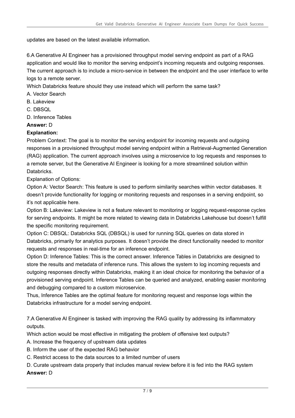 Get Valid Databricks Generative AI Engineer Associate Exam Dumps For Quick Success updates are based on the latest available information. 6.A Generative AI Engineer has a provisioned throughput model serving endpoint as part of a RAG application and would like to monitor the serving endpoint’s incoming requests and outgoing responses. The current approach is to include a micro-service in between the endpoint and the user interface to write logs to a remote server. Which Databricks feature should they use instead which will perform the same task? A. Vector Search B. Lakeview C. DBSQL D. Inference Tables Answer: D Explanation: Problem Context: The goal is to monitor the serving endpoint for incoming requests and outgoing responses in a provisioned throughput model serving endpoint within a Retrieval-Augmented Generation (RAG) application. The current approach involves using a microservice to log requests and responses to a remote server, but the Generative AI Engineer is looking for a more streamlined solution within Databricks. Explanation of Options: Option A: Vector Search: This feature is used to perform similarity searches within vector databases. It doesn’t provide functionality for logging or monitoring requests and responses in a serving endpoint, so it’s not applicable here. Option B: Lakeview: Lakeview is not a feature relevant to monitoring or logging request-response cycles for serving endpoints. It might be more related to viewing data in Databricks Lakehouse but doesn’t fulfill the specific monitoring requirement. Option C: DBSQL: Databricks SQL (DBSQL) is used for running SQL queries on data stored in Databricks, primarily for analytics purposes. It doesn’t provide the direct functionality needed to monitor requests and responses in real-time for an inference endpoint. Option D: Inference Tables: This is the correct answer. Inference Tables in Databricks are designed to store the results and metadata of inference runs. This allows the system to log incoming requests and outgoing responses directly within Databricks, making it an ideal choice for monitoring the behavior of a provisioned serving endpoint. Inference Tables can be queried and analyzed, enabling easier monitoring and debugging compared to a custom microservice. Thus, Inference Tables are the optimal feature for monitoring request and response logs within the Databricks infrastructure for a model serving endpoint. 7.A Generative Al Engineer is tasked with improving the RAG quality by addressing its inflammatory outputs. Which action would be most effective in mitigating the problem of offensive text outputs? A. Increase the frequency of upstream data updates B. Inform the user of the expected RAG behavior C. Restrict access to the data sources to a limited number of users D. Curate upstream data properly that includes manual review before it is fed into the RAG system Answer: D 7 / 9