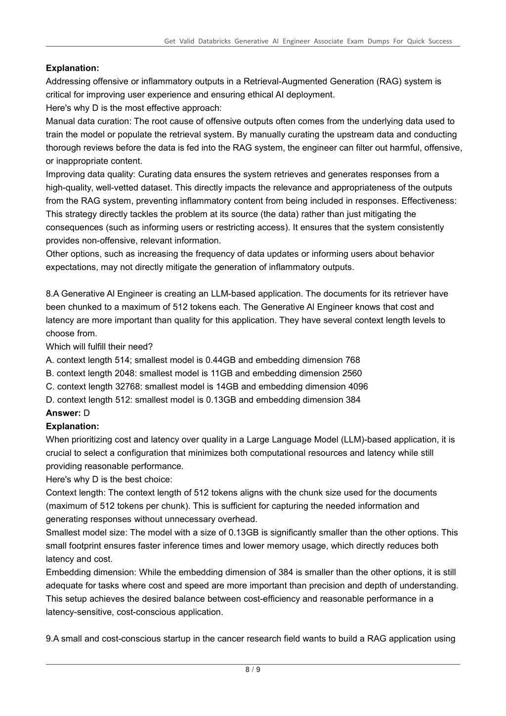 Get Valid Databricks Generative AI Engineer Associate Exam Dumps For Quick Success Explanation: Addressing offensive or inflammatory outputs in a Retrieval-Augmented Generation (RAG) system is critical for improving user experience and ensuring ethical AI deployment. Here's why D is the most effective approach: Manual data curation: The root cause of offensive outputs often comes from the underlying data used to train the model or populate the retrieval system. By manually curating the upstream data and conducting thorough reviews before the data is fed into the RAG system, the engineer can filter out harmful, offensive, or inappropriate content. Improving data quality: Curating data ensures the system retrieves and generates responses from a high-quality, well-vetted dataset. This directly impacts the relevance and appropriateness of the outputs from the RAG system, preventing inflammatory content from being included in responses. Effectiveness: This strategy directly tackles the problem at its source (the data) rather than just mitigating the consequences (such as informing users or restricting access). It ensures that the system consistently provides non-offensive, relevant information. Other options, such as increasing the frequency of data updates or informing users about behavior expectations, may not directly mitigate the generation of inflammatory outputs. 8.A Generative Al Engineer is creating an LLM-based application. The documents for its retriever have been chunked to a maximum of 512 tokens each. The Generative Al Engineer knows that cost and latency are more important than quality for this application. They have several context length levels to choose from. Which will fulfill their need? A. context length 514; smallest model is 0.44GB and embedding dimension 768 B. context length 2048: smallest model is 11GB and embedding dimension 2560 C. context length 32768: smallest model is 14GB and embedding dimension 4096 D. context length 512: smallest model is 0.13GB and embedding dimension 384 Answer: D Explanation: When prioritizing cost and latency over quality in a Large Language Model (LLM)-based application, it is crucial to select a configuration that minimizes both computational resources and latency while still providing reasonable performance. Here's why D is the best choice: Context length: The context length of 512 tokens aligns with the chunk size used for the documents (maximum of 512 tokens per chunk). This is sufficient for capturing the needed information and generating responses without unnecessary overhead. Smallest model size: The model with a size of 0.13GB is significantly smaller than the other options. This small footprint ensures faster inference times and lower memory usage, which directly reduces both latency and cost. Embedding dimension: While the embedding dimension of 384 is smaller than the other options, it is still adequate for tasks where cost and speed are more important than precision and depth of understanding. This setup achieves the desired balance between cost-efficiency and reasonable performance in a latency-sensitive, cost-conscious application. 9.A small and cost-conscious startup in the cancer research field wants to build a RAG application using 8 / 9