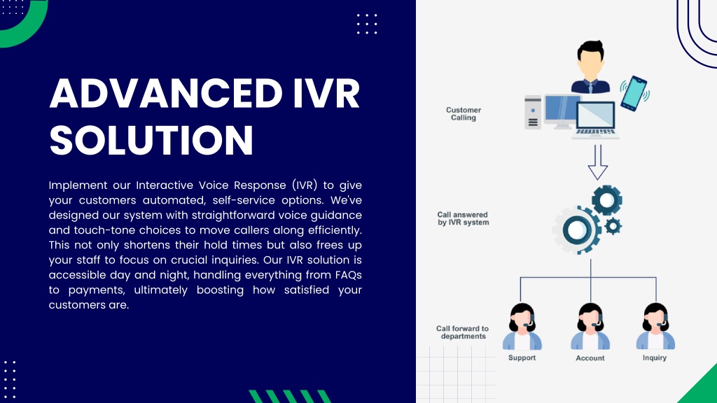 ADVANCED IVR SOLUTION Implement our Interactive Voice Response (IVR) to give your customers automated, self-service options. We've designed our system with straightforward voice guidance and touch-tone choices to move callers along efficiently. This not only shortens their hold times but also frees up your staff to focus on crucial inquiries. Our IVR solution is accessible day and night, handling everything from FAQs to payments, ultimately boosting how satisfied your customers are.