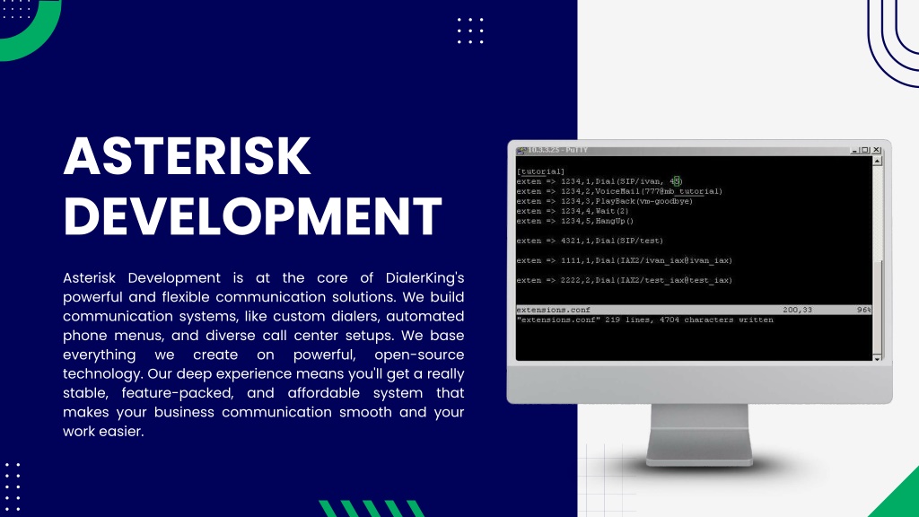 ASTERISK DEVELOPMENT Asterisk Development is at the core of DialerKing's powerful and flexible communication solutions. We build communication systems, like custom dialers, automated phone menus, and diverse call center setups. We base everything we create on technology. Our deep experience means you'll get a really stable, feature-packed, and affordable system that makes your business communication smooth and your work easier. powerful, open-source