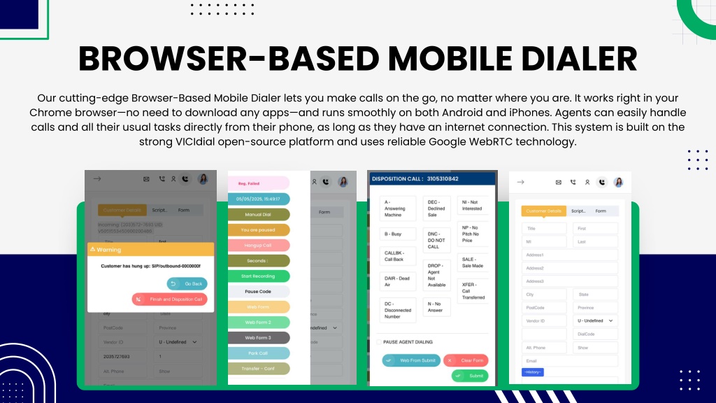 BROWSER-BASED MOBILE DIALER Our cutting-edge Browser-Based Mobile Dialer lets you make calls on the go, no matter where you are. It works right in your Chrome browser—no need to download any apps—and runs smoothly on both Android and iPhones. Agents can easily handle calls and all their usual tasks directly from their phone, as long as they have an internet connection. This system is built on the strong VICIdial open-source platform and uses reliable Google WebRTC technology.