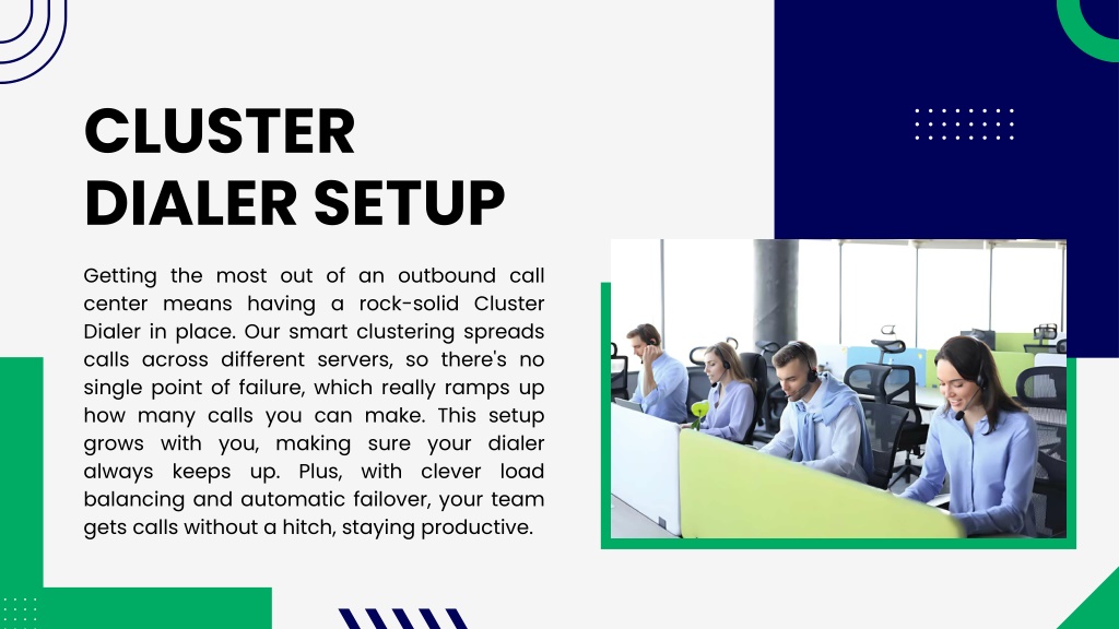 CLUSTER DIALER SETUP Getting the most out of an outbound call center means having a rock-solid Cluster Dialer in place. Our smart clustering spreads calls across different servers, so there's no single point of failure, which really ramps up how many calls you can make. This setup grows with you, making sure your dialer always keeps up. Plus, with clever load balancing and automatic failover, your team gets calls without a hitch, staying productive.
