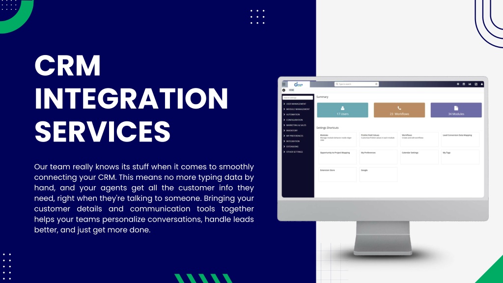 CRM INTEGRATION SERVICES Our team really knows its stuff when it comes to smoothly connecting your CRM. This means no more typing data by hand, and your agents get all the customer info they need, right when they're talking to someone. Bringing your customer details and communication tools together helps your teams personalize conversations, handle leads better, and just get more done.