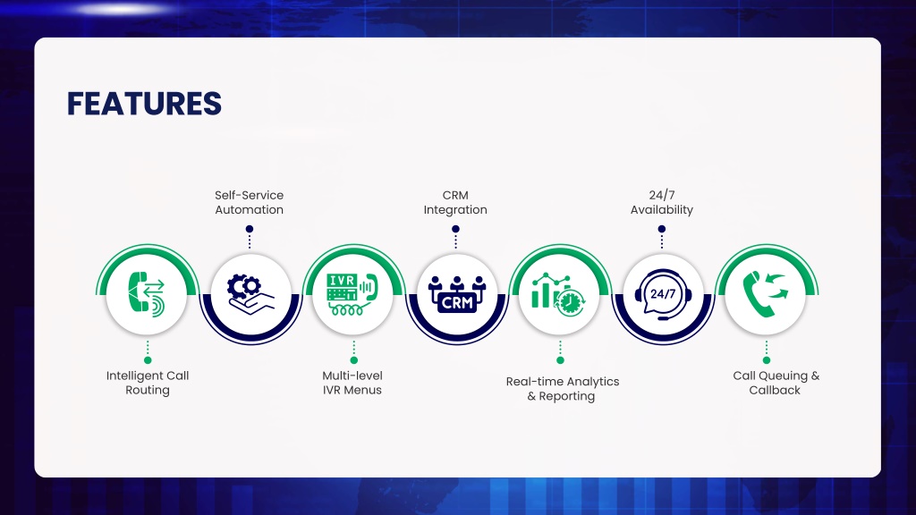 FEATURES Self-Service Automation CRM 24/7 Integration Availability Intelligent Call Routing Multi-level IVR Menus Call Queuing & Callback Real-time Analytics & Reporting