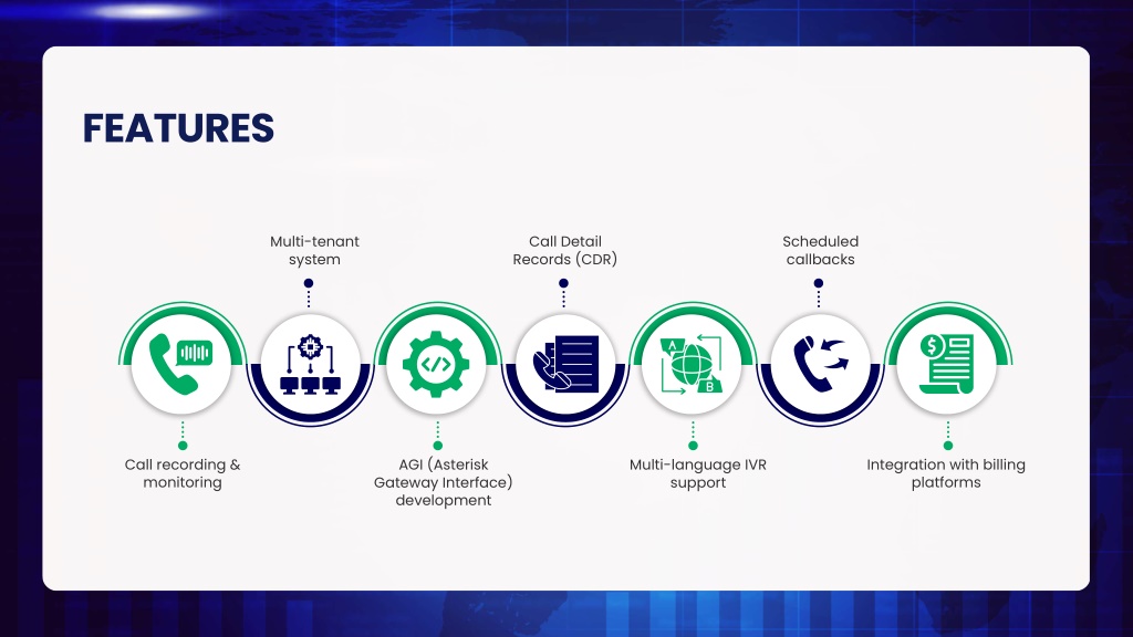 FEATURES Multi-tenant system Call Detail Records (CDR) Scheduled callbacks Call recording & monitoring Integration with billing platforms AGI (Asterisk Gateway Interface) development Multi-language IVR support