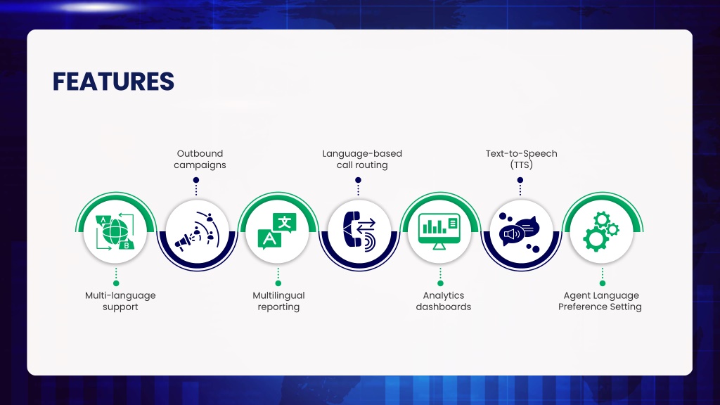 FEATURES Outbound campaigns Language-based call routing Text-to-Speech (TTS) Agent Language Preference Setting Multi-language support Multilingual reporting Analytics dashboards