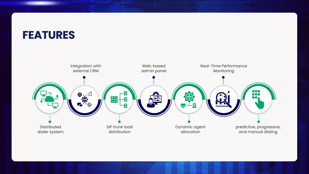 FEATURES Integration with external CRM Web-based admin panel Real-Time Performance Monitoring Distributed dialer system SIP trunk load distribution Dynamic agent allocation predictive, progressive, and manual dialing