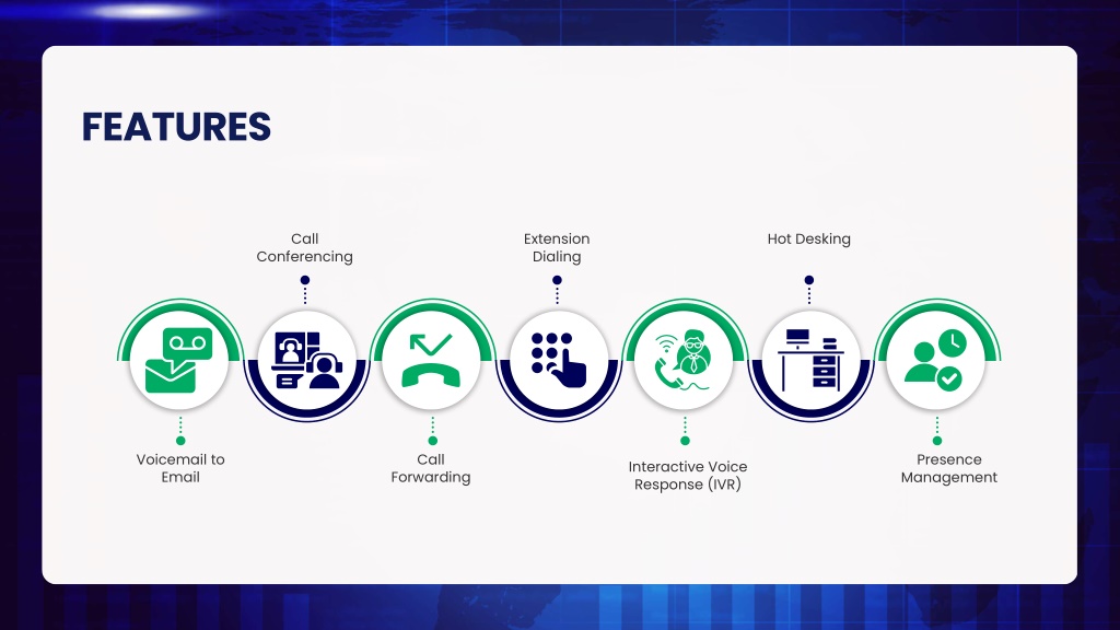 FEATURES Call Extension Dialing Hot Desking Conferencing Voicemail to Email Call Presence Management Interactive Voice Response (IVR) Forwarding