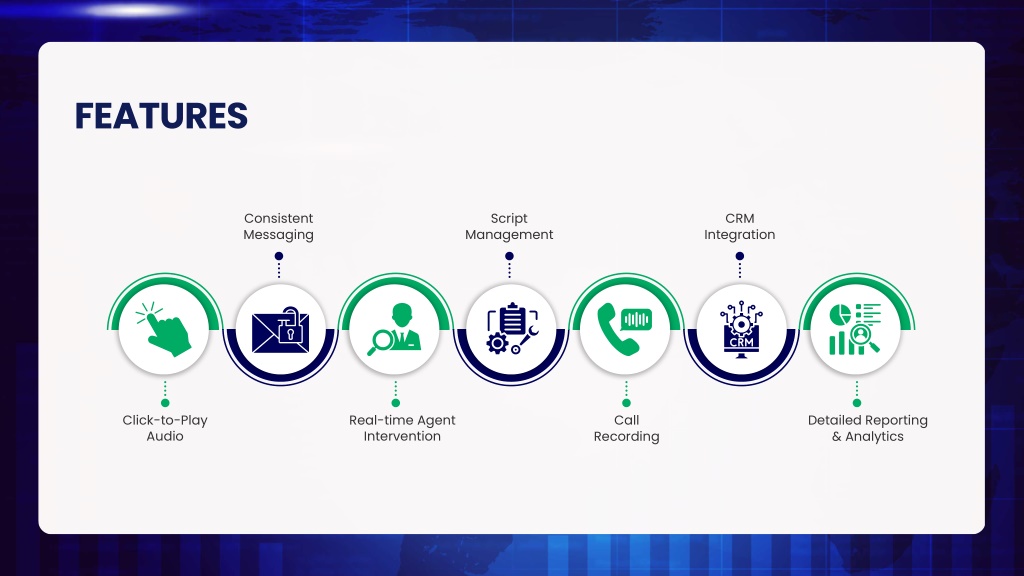 FEATURES Consistent Messaging Script CRM Management Integration Click-to-Play Audio Real-time Agent Intervention Call Detailed Reporting & Analytics Recording