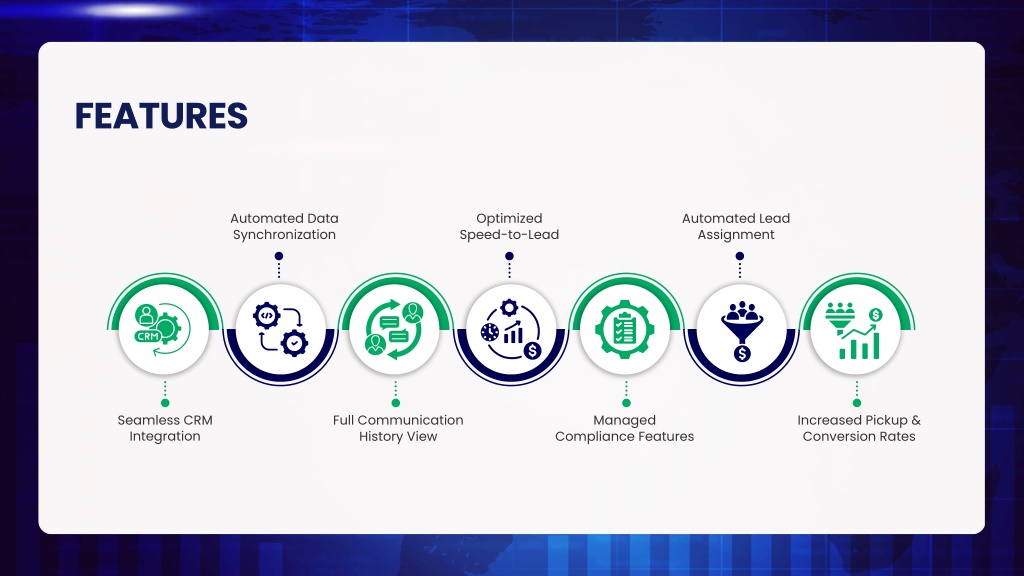 FEATURES Automated Data Synchronization Optimized Speed-to-Lead Automated Lead Assignment Seamless CRM Integration Full Communication History View Managed Increased Pickup & Conversion Rates Compliance Features