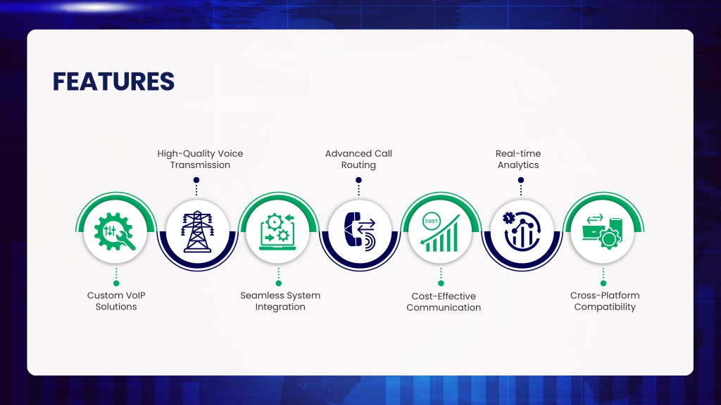 FEATURES High-Quality Voice Transmission Advanced Call Routing Real-time Analytics Custom VoIP Solutions Seamless System Integration Cross-Platform Compatibility Cost-Effective Communication