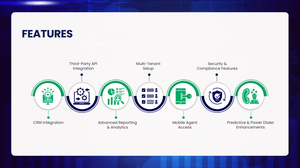 FEATURES Third-Party API Integration Multi-Tenant Setup Security & Compliance Features CRM Integration Predictive & Power Dialer Enhancements Advanced Reporting & Analytics Mobile Agent Access
