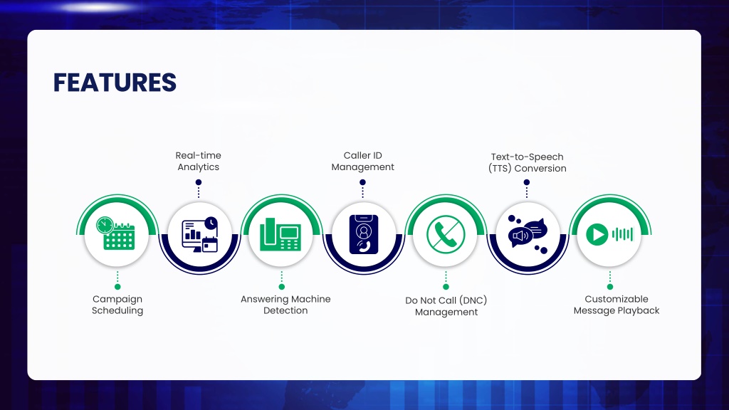 FEATURES Real-time Analytics Caller ID Management Text-to-Speech (TTS) Conversion Campaign Scheduling Answering Machine Detection Customizable Message Playback Do Not Call (DNC) Management