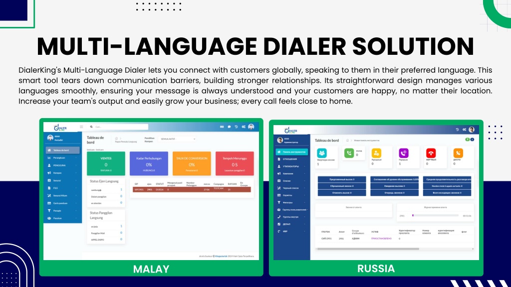 MULTI-LANGUAGE DIALER SOLUTION DialerKing's Multi-Language Dialer lets you connect with customers globally, speaking to them in their preferred language. This smart tool tears down communication barriers, building stronger relationships. Its straightforward design manages various languages smoothly, ensuring your message is always understood and your customers are happy, no matter their location. Increase your team's output and easily grow your business; every call feels close to home. RUSSIA MALAY