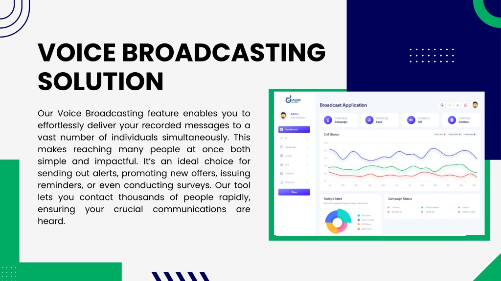 VOICE BROADCASTING SOLUTION Our Voice Broadcasting feature enables you to effortlessly deliver your recorded messages to a vast number of individuals simultaneously. This makes reaching many people at once both simple and impactful. It’s an ideal choice for sending out alerts, promoting new offers, issuing reminders, or even conducting surveys. Our tool lets you contact thousands of people rapidly, ensuring your crucial communications are heard.