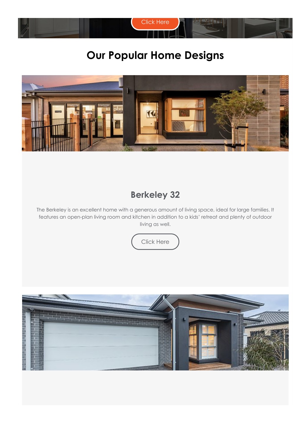 Click Here Our Popular Home Designs Berkeley 32 The Berkeley is an excellent home with a generous amount of living space, ideal for large families. It features an openplan living room and kitchen in addition to a kids’ retreat and plenty of outdoor living as well. Click Here