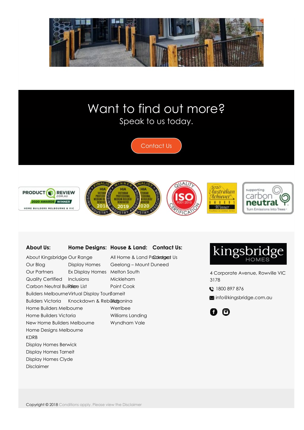 Want to find out more? Speak to us today. Contact Us About Us: Home Designs: House & Land: Contact Us: About Kingsbridge Our Blog Our Partners Quality Certified Carbon Neutral Builder Builders Melbourne Builders Victoria Home Builders Melbourne Home Builders Victoria New Home Builders Melbourne Home Designs Melbourne KDRB Display Homes Berwick Display Homes Tarneit Display Homes Clyde Disclaimer Our Range Display Homes Ex Display Homes Inclusions Price List Virtual Display Tours Knockdown & Rebuilds All Home & Land Packages Geelong – Mount Duneed Melton South Mickleham Point Cook Tarneit Truganina Werribee Williams Landing Wyndham Vale Contact Us 4 Corporate Avenue, Rowville VIC 3178 1800 897 876 info@kingsbridge.com.au Copyright © 2018 Conditions apply. Please view the Disclaimer