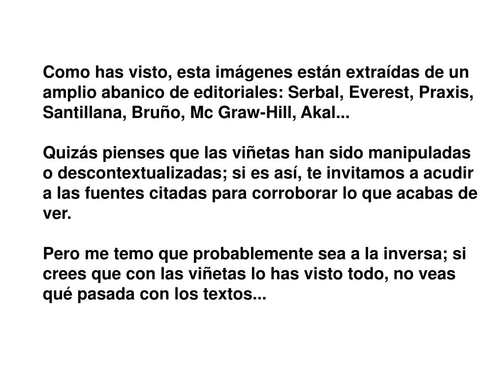 Como has visto, esta imágenes están extraídas de un amplio abanico de editoriales: Serbal, Everest, Praxis, Santillana, Bruño, Mc Graw-Hill, Akal... Quizás pienses que las viñetas han sido manipuladas o descontextualizadas; si es así, te invitamos a acudir a las fuentes citadas para corroborar lo que acabas de ver. Pero me temo que probablemente sea a la inversa; si crees que con las viñetas lo has visto todo, no veas qué pasada con los textos...