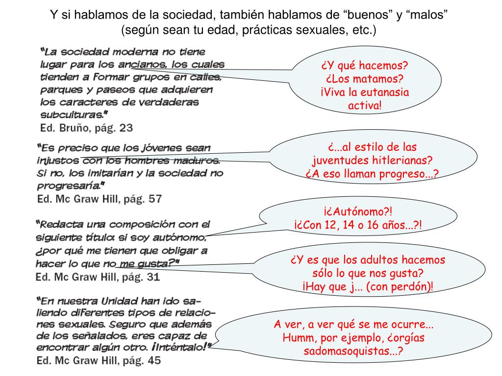 Y si hablamos de la sociedad, también hablamos de “buenos” y “malos” (según sean tu edad, prácticas sexuales, etc.) ¿Y qué hacemos? ¿Los matamos? ¡Viva la eutanasia activa! ¿...al estilo de las juventudes hitlerianas? ¿A eso llaman progreso...? ¡¿Autónomo?! ¡¿Con 12, 14 o 16 años...?! ¿Y es que los adultos hacemos sólo lo que nos gusta? ¡Hay que j... (con perdón)! A ver, a ver qué se me ocurre... Humm, por ejemplo, ¿orgías sadomasoquistas...?
