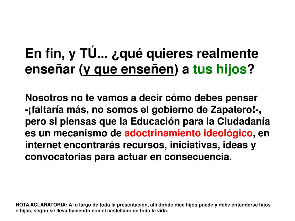En fin, y TÚ... ¿qué quieres realmente enseñar (y que enseñen) a tus hijos? Nosotros no te vamos a decir cómo debes pensar -¡faltaría más, no somos el gobierno de Zapatero!-, pero si piensas que la Educación para la Ciudadanía es un mecanismo de adoctrinamiento ideológico, en internet encontrarás recursos, iniciativas, ideas y convocatorias para actuar en consecuencia. NOTA ACLARATORIA: A lo largo de toda la presentación, allí donde dice hijos puede y debe entenderse hijos e hijas, según se lleva haciendo con el castellano de toda la vida.