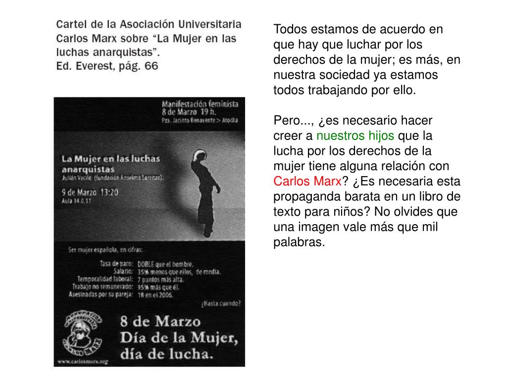 Todos estamos de acuerdo en que hay que luchar por los derechos de la mujer; es más, en nuestra sociedad ya estamos todos trabajando por ello. Pero..., ¿es necesario hacer creer a nuestros hijos que la lucha por los derechos de la mujer tiene alguna relación con Carlos Marx? ¿Es necesaria esta propaganda barata en un libro de texto para niños? No olvides que una imagen vale más que mil palabras.
