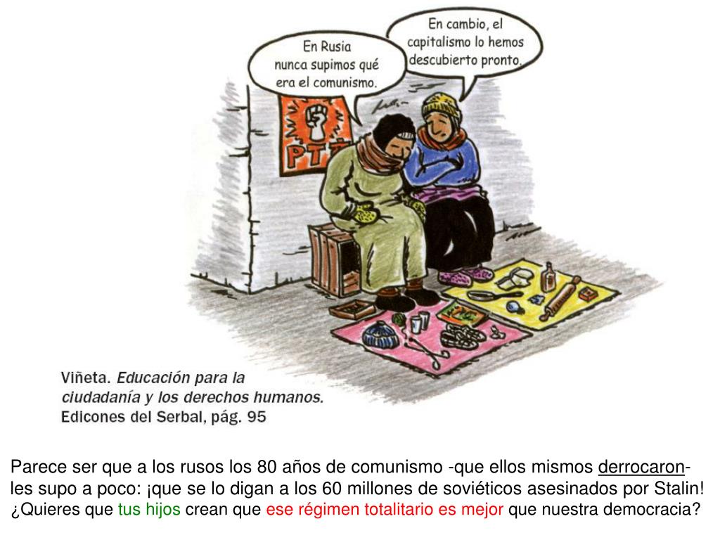 Parece ser que a los rusos los 80 años de comunismo -que ellos mismos derrocaron- les supo a poco: ¡que se lo digan a los 60 millones de soviéticos asesinados por Stalin! ¿Quieres que tus hijos crean que ese régimen totalitario es mejor que nuestra democracia?