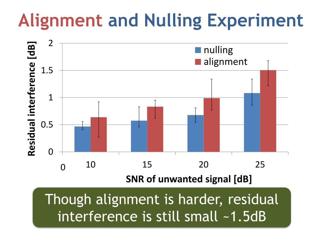Alignment and Nulling Experiment 0 Though alignment is harder, residual interference is still small ~1.5dB