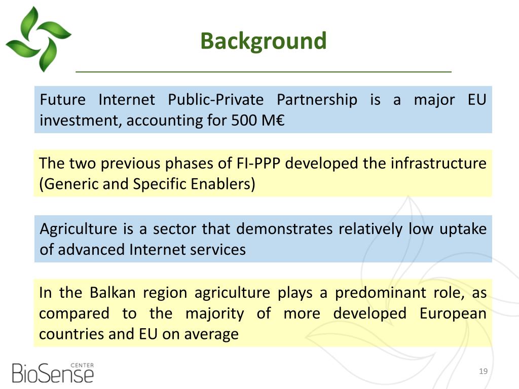 Background Future Internet Public-Private Partnership is a major EU investment, accounting for 500 M€ The two previous phases of FI-PPP developed the infrastructure (Generic and Specific Enablers) Agriculture is a sector that demonstrates relatively low uptake of advanced Internet services In the Balkan region agriculture plays a predominant role, as compared to the majority of more developed European countries and EU on average