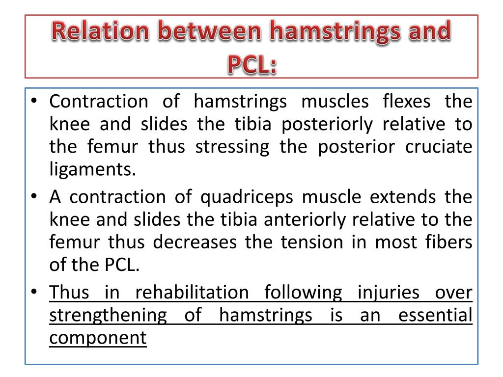 Relation between hamstrings and PCL: • Contraction of hamstrings muscles flexes the knee and slides the tibia posteriorly relative to the femur thus stressing the posterior cruciate ligaments. • A contraction of quadriceps muscle extends the knee and slides the tibia anteriorly relative to the femur thus decreases the tension in most fibers of the PCL. • Thus in rehabilitation following injuries over strengthening of hamstrings is an essential component
