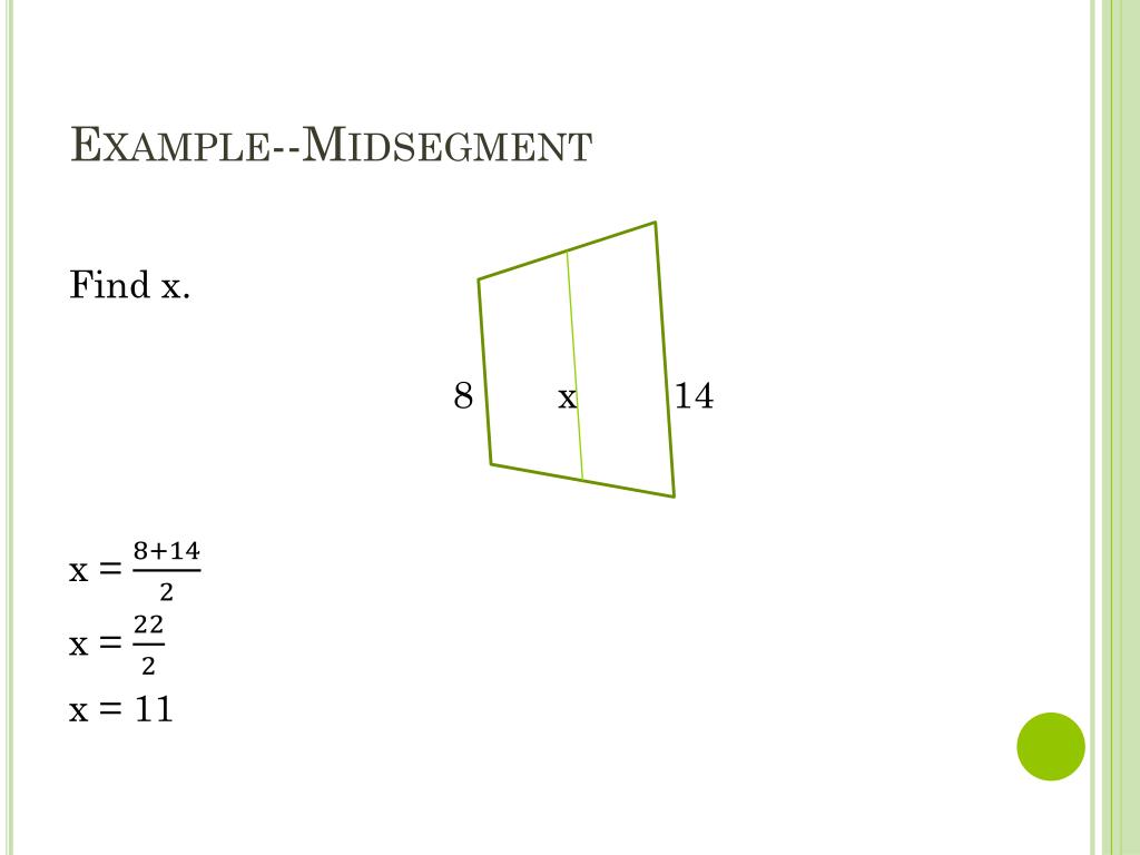 Example--Midsegment Find x. 8 x 14 x = x = x = 11