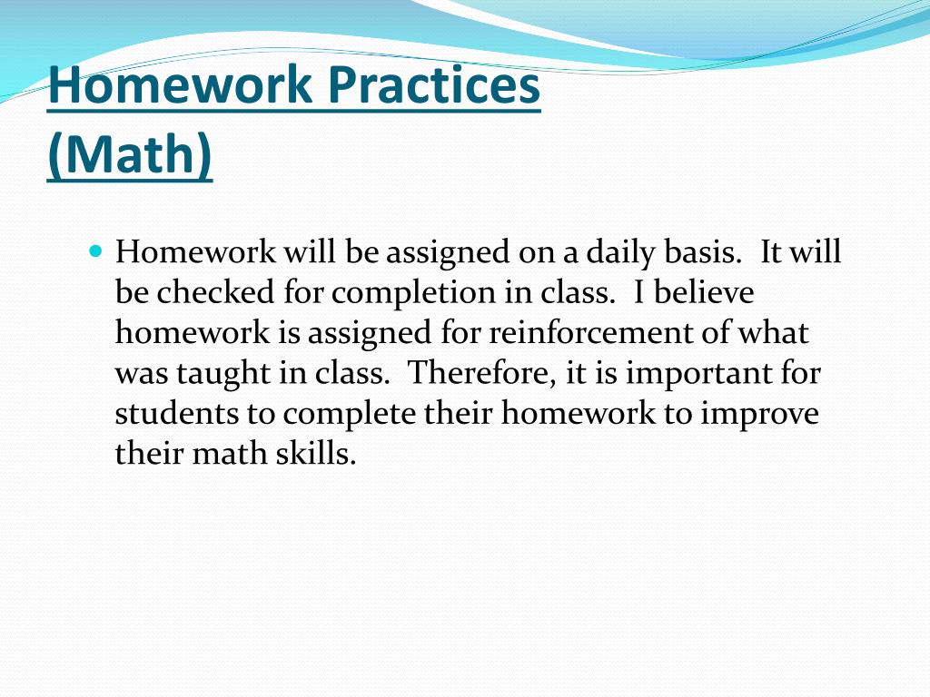 Homework Practices(Math) • Homework will be assigned on a daily basis. It will be checked for completion in class. I believe homework is assigned for reinforcement of what was taught in class. Therefore, it is important for students to complete their homework to improve their math skills.