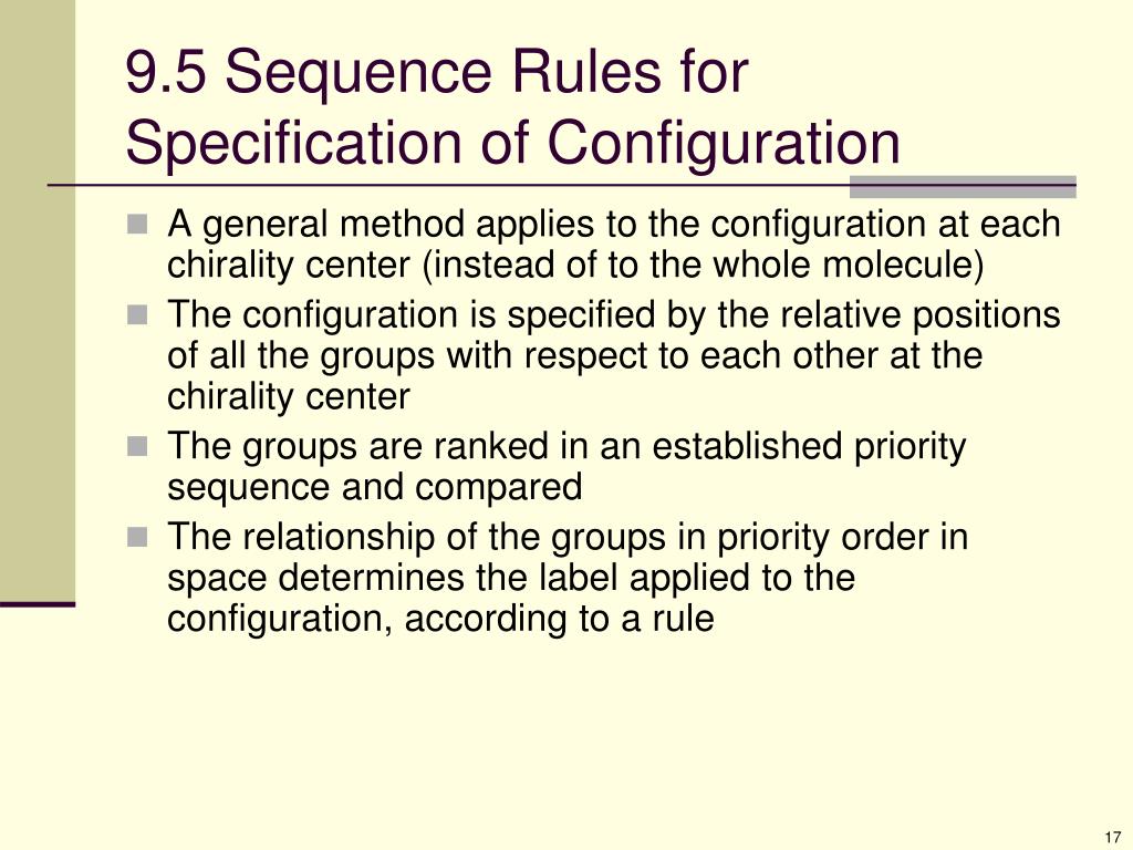 9.5 Sequence Rules for Specification of Configuration • A general method applies to the configuration at each chirality center (instead of to the whole molecule) • The configuration is specified by the relative positions of all the groups with respect to each other at the chirality center • The groups are ranked in an established priority sequence and compared • The relationship of the groups in priority order in space determines the label applied to the configuration, according to a rule