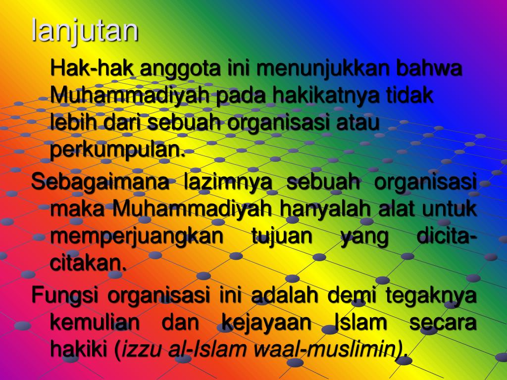lanjutan Hak-hakanggotainimenunjukkanbahwaMuhammadiyahpadahakikatnyatidaklebihdarisebuahorganisasiatauperkumpulan. SebagaimanalazimnyasebuahorganisasimakaMuhammadiyahhanyalahalatuntukmemperjuangkantujuan yang dicita-citakan. Fungsiorganisasiiniadalahdemitegaknyakemuliandankejayaan Islam secarahakiki (izzu al-Islam waal-muslimin).