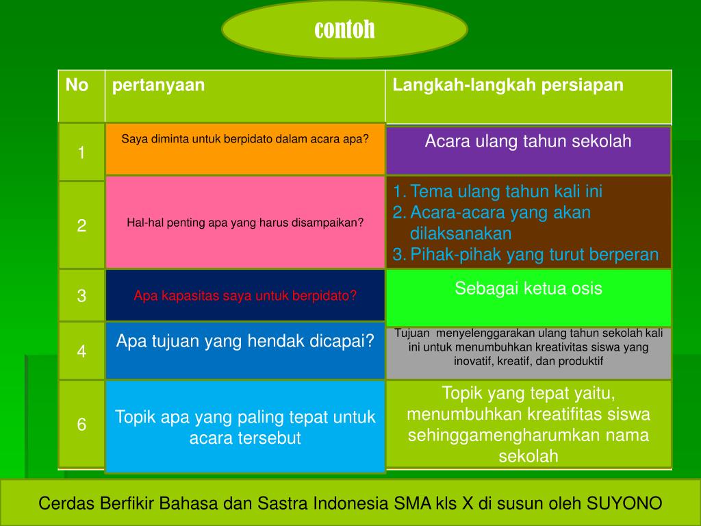 contoh 1 Sayadimintauntukberpidatodalamacaraapa? Acaraulangtahunsekolah Hal-halpentingapa yang harusdisampaikan? • Temaulangtahun kali ini • Acara-acara yang akandilaksanakan • Pihak-pihak yang turutberperan 2 3 Apakapasitassayauntukberpidato? Sebagaiketuaosis 4 Apatujuan yang hendakdicapai? Tujuanmenyelenggarakanulangtahunsekolah kali iniuntukmenumbuhkankreativitassiswa yang inovatif, kreatif, danproduktif 6 Topikapa yang paling tepatuntukacaratersebut Topik yang tepatyaitu, menumbuhkankreatifitassiswasehinggamengharumkannamasekolah CerdasBerfikirBahasadanSastra Indonesia SMA kls X disusunoleh SUYONO