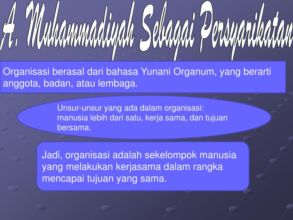 A. Muhammadiyah Sebagai Persyarikatan OrganisasiberasaldaribahasaYunaniOrganum, yang berartianggota, badan, ataulembaga. Unsur-unsur yang adadalamorganisasi: manusialebihdarisatu, kerjasama, dantujuanbersama. Jadi, organisasiadalahsekelompokmanusia yang melakukankerjasamadalamrangkamencapaitujuan yang sama.