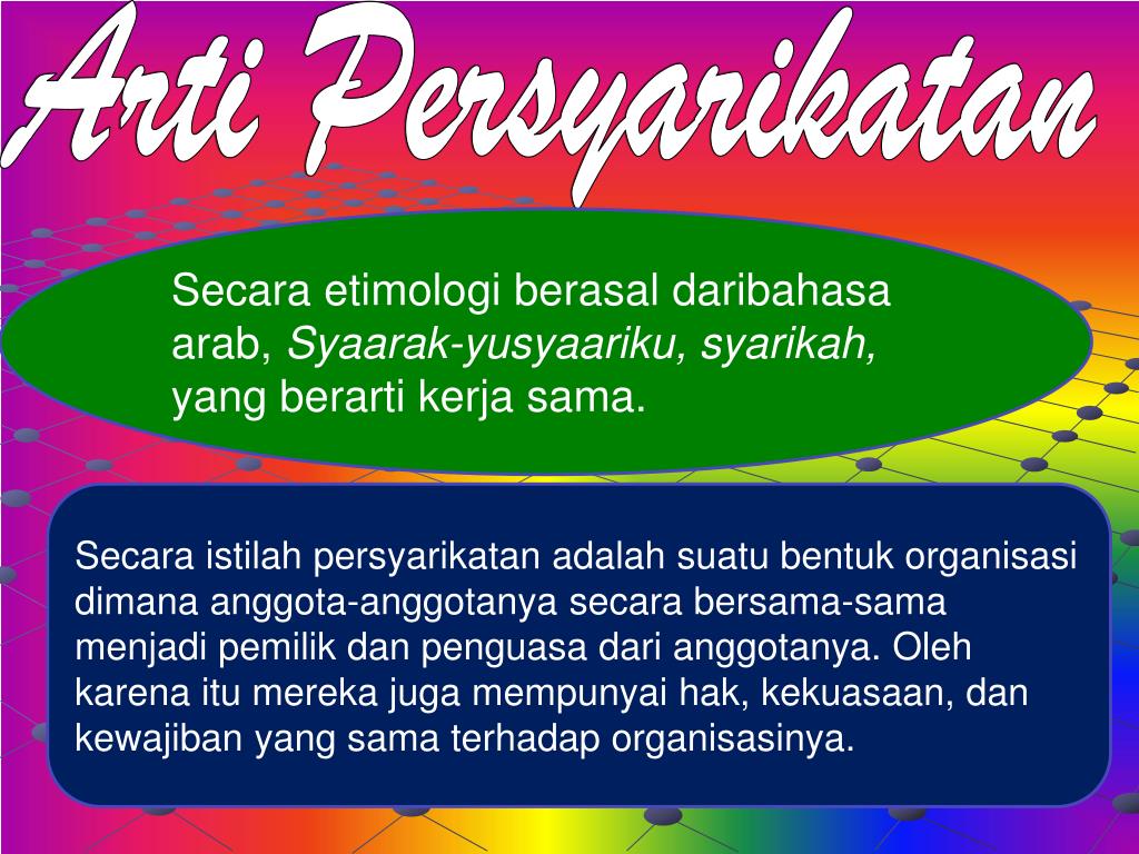Arti Persyarikatan Secaraetimologiberasaldaribahasaarab, Syaarak-yusyaariku, syarikah, yang berartikerjasama. Secaraistilahpersyarikatanadalahsuatubentukorganisasidimanaanggota-anggotanyasecarabersama-samamenjadipemilikdanpenguasadarianggotanya. Olehkarenaitumerekajugamempunyaihak, kekuasaan, dankewajiban yang samaterhadaporganisasinya.