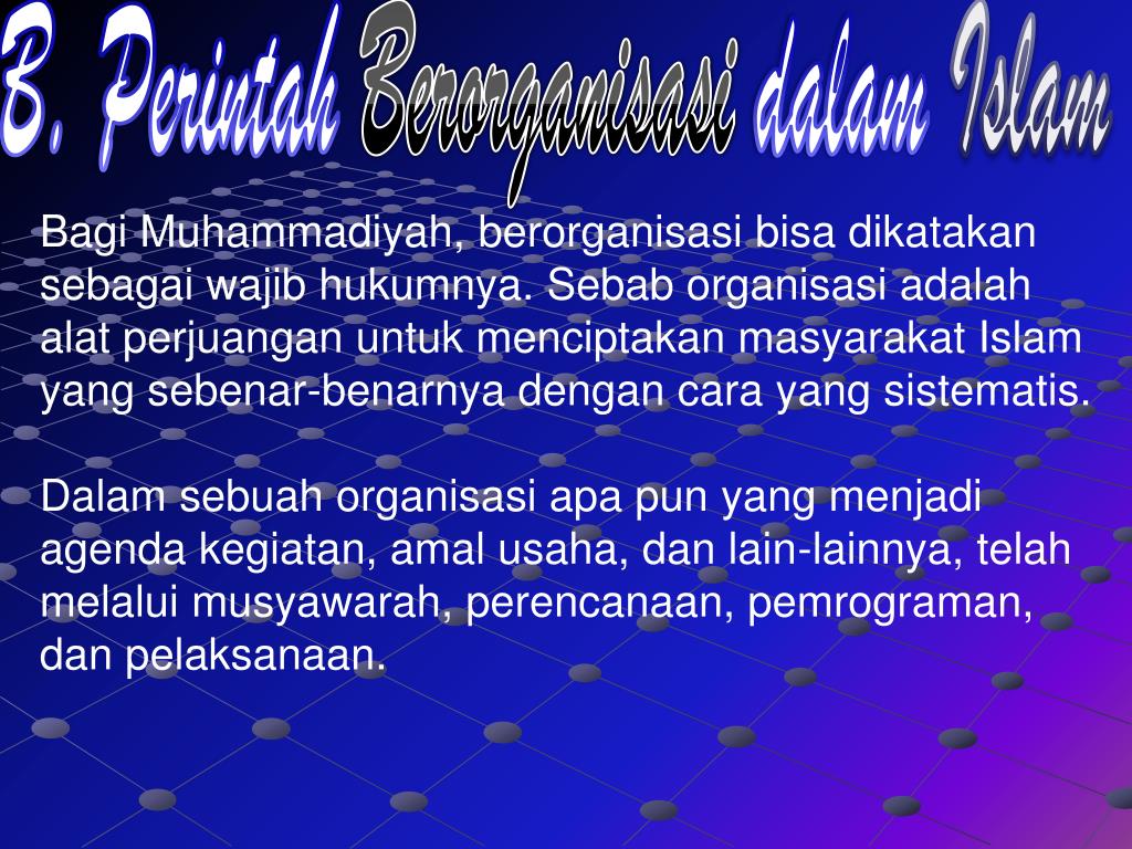 B. PerintahBerorganisasidalamIslam Bagi Muhammadiyah, berorganisasi bisa dikatakan sebagai wajib hukumnya. Sebab organisasi adalah alat perjuangan untuk menciptakan masyarakat Islam yang sebenar-benarnya dengan cara yang sistematis. Dalam sebuah organisasi apa pun yang menjadi agenda kegiatan, amal usaha, dan lain-lainnya, telah melalui musyawarah, perencanaan, pemrograman, dan pelaksanaan.